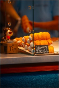 Close-up of Schaumrolle pastries in a bakery in Hallstatt, Austria with tip box and blurred figure.