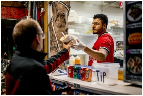 Street vendor serves food to a customer at an outd