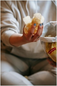 A close-up image of a female hand holding crispy potato chips in a relaxed indoor setting.