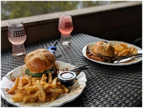 Tasty burgers with fries and pink beverages on an outdoor table setting.