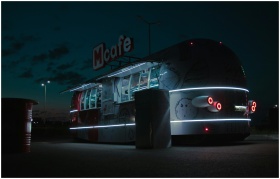 Illuminated McCafe food truck parked at night, off