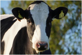 Black and white Holstein cow gazing at camera in rural setting with blurred green background.