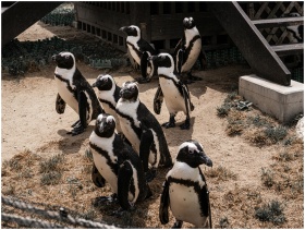 A group of African penguins standing on sandy ground in an outdoor zoo setting.