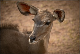 A detailed portrait of a female greater kudu with expressive eyes and striking ears, embodying African wildlife.