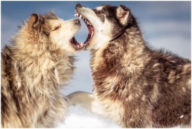 Two wolves playfully interacting in a snowy landscape, showcasing animal behavior and wild beauty.