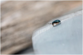 A detailed macro shot of a beetle on the edge of a natural surface, showcasing its intricate features.