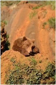 Brown bear lying on a sunlit rocky terrain with lush vegetation in CB, España.