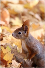 Red squirrel on fallen autumn leaves captures the seasonal charm outdoors.