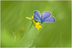 Close-up of a blue butterfly resting on a yellow flower in a lush green field.