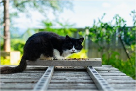 A black and white cat sitting on a wooden platform outdoors in Nagano, Japan.