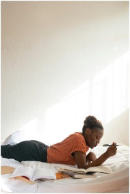 A young woman enjoys leisurely reading while lying