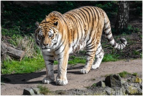 Close-up of an Amur tiger walking in Leipzig Zoo, showcasing its majestic stripes and powerful stance.