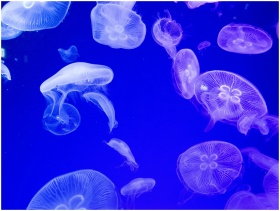A stunning view of jellyfish gracefully swimming in blue ocean light.