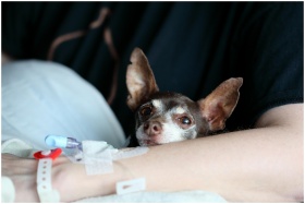 A chihuahua cuddling with a person receiving medical care, portraying warmth and companionship.