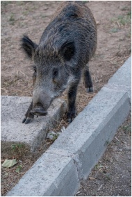 A wild boar walks along a pavement edge, showcasing its natural habitat.