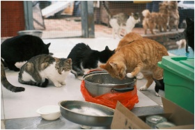 Several cats of various colors eating from dishes in an animal shelter setting.