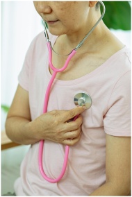 Crop unrecognizable serious middle age female in casual outfit using pink stethoscope on chest while sitting in bright house