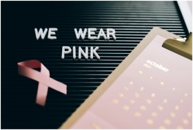 Pink ribbon, calendar, and board with 'We Wear Pin