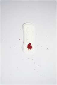 Sanitary pad on white background with blood stain, representing menstrual hygiene.