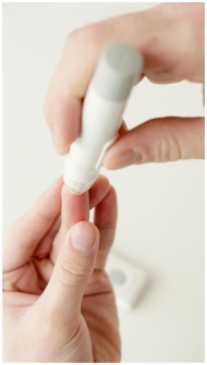 A person using a lancet pen to check blood sugar l