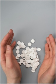 A close-up of hands surrounding white pills on a g