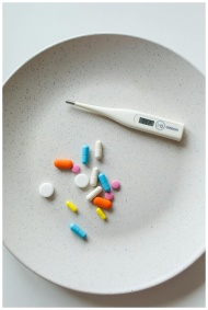 An assortment of colorful pills and a digital thermometer on a white plate, symbolizing healthcare and medication.