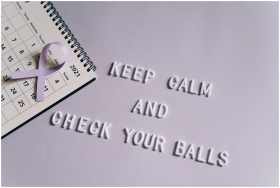 Calendar with quote promoting testicular cancer awareness and a purple ribbon.