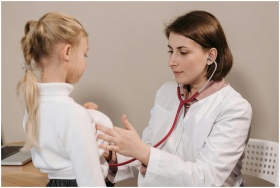 Doctor performing a health check-up on a child using a stethoscope in a clinic setting.