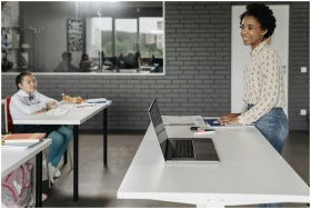 Teacher engaging with student in a modern classroom setting, promoting education and interaction.