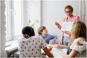 A teacher in a classroom with students, focusing o