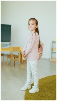Cute young girl wearing a backpack, smiling in a classroom. Ideal for back-to-school themes.