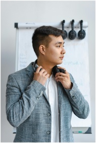 Asian man standing indoors with headphones, wearing a gray suit.