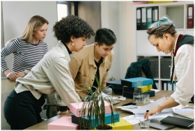 A group of professionals brainstorming and working