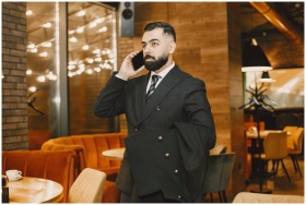 Bearded man in black suit talking on phone in a chic cafe setting.