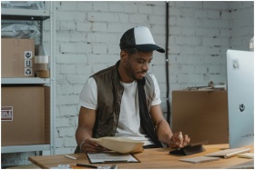 A man in a warehouse managing e-commerce orders and using a tablet for logistics.