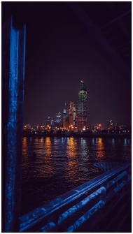 Vibrant city skyline at night reflecting on the water, showcasing modern urban architecture.