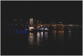 Captivating night view of a cityscape with illuminated buildings and reflections on water.
