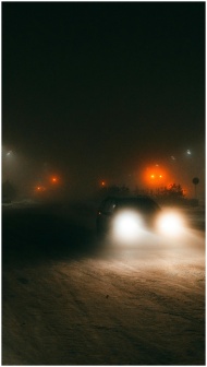 A car drives through snowy streets at night with glowing headlights and streetlights.