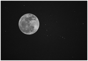 A detailed black and white photo of the full moon surrounded by stars in the night sky.