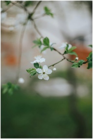 Delicate white blossoms on a branch against a blur