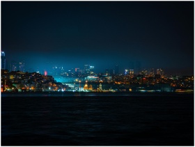 Captivating night view of Istanbul's illuminated skyline across the water with buildings and city lights.
