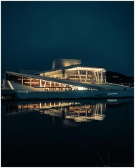 The striking Oslo Opera House glows warmly, reflecting in calm waterfront at night.