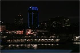 Vibrant cityscape featuring glowing blue skyscraper and harbor at night.