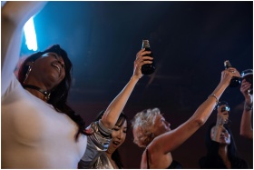 Diverse group of happy friends raising their drinks on a fun night out at a club.