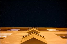 Captivating night view of a building facade with a starry sky backdrop, highlighting architectural detail.