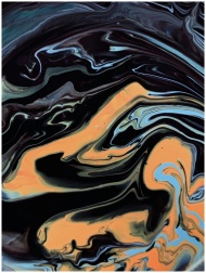 Abstract fluid art featuring swirling patterns of black, blue, and orange hues in vivid contrast.