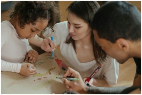 A family drawing together on cardboard, expressing creativity and spending quality time.