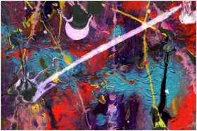 A colorful and dynamic abstract painting with swirling acrylic textures.