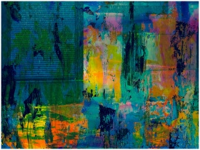 A vivid and colorful abstract painting featuring a blend of vibrant hues, texture, and expressive brush strokes.