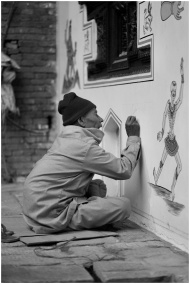 Elderly man engrossed in painting a traditional mural on a Bhaktapur wall.